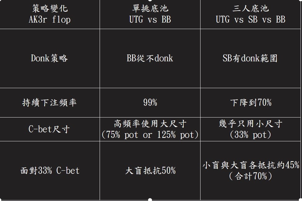 多人池翻後策略介紹(附課程資訊) Post author:撲克 領域 Post published:2025 年 8 月 18 日 Post category:撲克教室 / 最新消息 / 講座資訊 / 進階策略 Post comments:0 Comments 本文運用 GTO Wizard 最新推出的多人池翻後運算功能,解析翻後多人底池與單挑底池的策略差異,協助大家掌握多人池的基本打法要點。幫助玩家在這個現場牌局中極為常見的情境裡,減少犯錯的頻率。 限時錦標賽的象徵:多人運動如果要選一個關鍵字來代表限時錦標賽,那可能就是”多人池”。open call一圈,Raise蓋兩家,可以說是限時錦標賽的日常。現場賽事中,翻後多人底池占比可能高達60-70%,然而過去卻沒有GTO solver能針對這個狀況做運算分析。本月 GTO Wizard 推出最新的三人池翻後運算功能,讓我們得以更精準的掌握多人池的策略樣貌。本文將透過比較單挑底池與三人底池的翻後策略變化,拆解其中的核心概念,協助玩家在翻後的多人運動中,建立正確的思維框架。 AK3彩虹面:單挑池與三人池以下分析中,我們設置的場景為:1、有效碼量175bb,UTG open 3bb,大盲位跟注。(Chip EV)2、UTG open 3bb,小盲位與大盲位跟注。(Chip EV)正常情況下,面對UTG開門,在中間無人跟注時,大盲位的跟注範圍會比有小盲位跟注時來的寬。為了減低範圍差異對翻後策略的影響,在設置上我們把大盲位的跟注範圍統一為場景2的範圍。另外,選擇AK3彩虹面,因為它是對UTG Raiser極為有利的翻牌,如果有產生任何策略變化的話,我們將更容易掌握其邏輯,並知道如何運用到其他類型的翻牌面。 多人池策略原則:少下注、小尺寸、強範圍我們把分析結果的幾項重要策略變化整理於表一。整體來說,三人底池與單挑底池的差異,大致可以總結為幾個要點:翻前加注者的池續下注頻率、個別跟注者的抵抗頻率皆下降。翻前加注者的池續下注尺寸縮小持續下注的範圍、跟注者抵抗的範圍,皆較為增強且兩極。 表一:單挑池與三人池策略變化 限時錦標賽策略-團體課程上述的分析結果,我們可以還可以進一步根據現場玩家特性做調整,制定針對性的剝削策略。例如:如果大小盲玩家跟注範圍更寬的時候,Raiser應該怎麼做?如果小盲玩家從不在多人池中donk,或者總是在多人池中用頂對donk,那Raiser要如何利用其特點呢?針對許多限時錦標賽可能遇到的狀況與疑問,都能在撲克領域九月份即將推出的”限時錦標賽策略團體班”中獲得解答。本課程預計涵蓋以下主題:限時錦標賽翻前範圍針對多人池的翻前範圍與策略調整翻後下注理論基礎單挑底池翻後要點多人池翻後策略調整限時錦標賽策略團體班,總計五堂課,價格$4500。有興趣的會員們歡迎洽詢撲克領域興大總店。 Tags: 課程資訊, 進階策略 閱讀更多文章 上一篇文章3-bet底池的持續下注-限時錦標賽策略學習班 下一篇不應持續下注的四種情況(一) 您可能還喜歡 無限注德州撲克競技規則(二):盲注與遊戲類型 2024 年 2 月 15 日 德州撲克的基本規則(上) 2021 年 12 月 14 日 恐懼風險與撲克決策 2025 年 5 月 1 日 發佈留言 取消回覆評論輸入您的姓名或用戶名以發表評論 輸入您的電子郵件地址以發表評論 輸入您的網站網址(可選) 在瀏覽器中儲存顯示名稱、電子郵件地址及個人網站網址,以供下次發佈留言時使用。