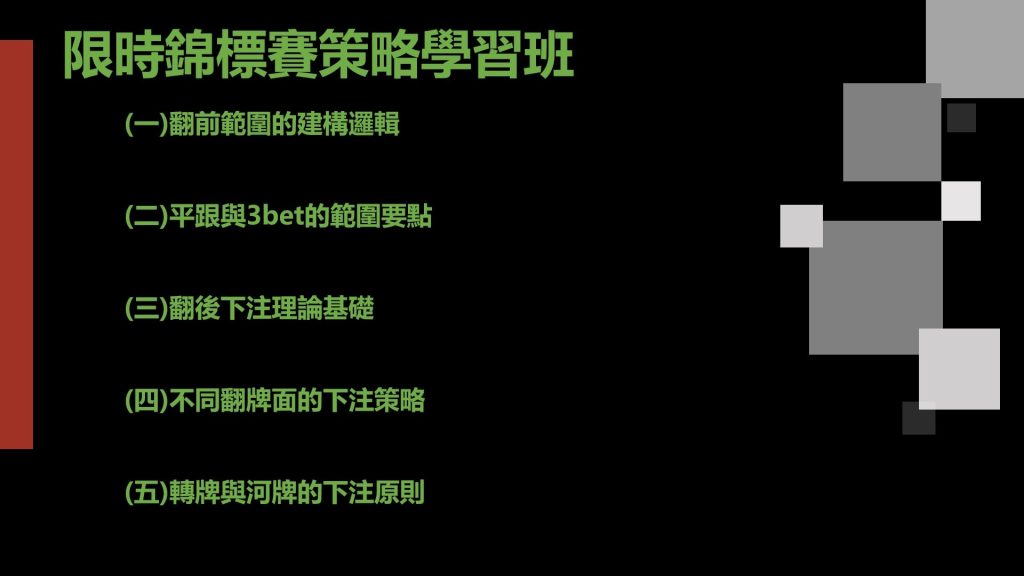 對於限時錦標賽這種著重深籌碼翻後策略的比賽,學會如何在各種翻牌面中,做適當的持續下注,選擇正確的尺寸,對於提升比賽的獲利至關重要。撲克領域新一期的團體課程將推出限時進標賽策略學習班,五堂課內容涵蓋150bb深籌碼的翻前範圍、翻後下注理論、以及各種翻牌面的下注策略整理。有興趣的會員可參考以下資訊: